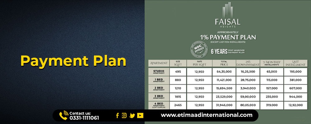 Faisal Heights offers a 6-year easy installment plan, making it affordable for everyone. It allows buyers to book a unit with only 1% per month, which is very friendly to the investor.