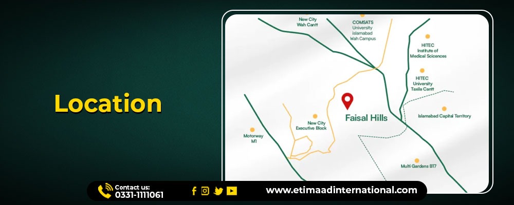 Faisal Hills is located on the main Grand Trunk (GT) Road near Taxila in the Rawalpindi‑Islamabad region. It has access to major road networks such as the M‑1 motorway, M‑2 motorway and the Rawalpindi‑Kohat road. The society is also close to the scenic Margalla Hills, giving residents views of greenery and hills nearby. Its location further makes it easy for commuting to Islamabad and Rawalpindi, and also gives good prospects for future value growth.